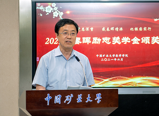 6月9日下午,中国矿业大学2021年春晖励志奖学金颁奖仪式在博学大讲堂举行。奖学金捐赠者李安昌和曹璎珞老师,副校长曹德欣,对外合作与发展处、学校教育发展基金会、数学学院相关负责人,数学学院全体获奖学生、近两年新入职青年教师参加了颁奖仪式。仪式由数学学院党委副书记许臣主持。