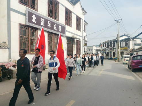 仪式后,院党委副书记纪承、院关工委常务副主任曹炜组织带领学员徒步前往渡江战役总前委旧址参观学习。穿山林,过村庄,一路上老师与同学们亲切交谈,感受着全面建设小康社会以来乡村发生的巨大变化。行至党建文化公园,纪承老师向学员们分享了身边的扶贫故事,表示学员们用脚走出的这一万多步,是重走长征路的一部分,作为新时代青年要谨遵习近平总书记的教诲,做到学史明理、学史增信、学史崇德、学史力行。