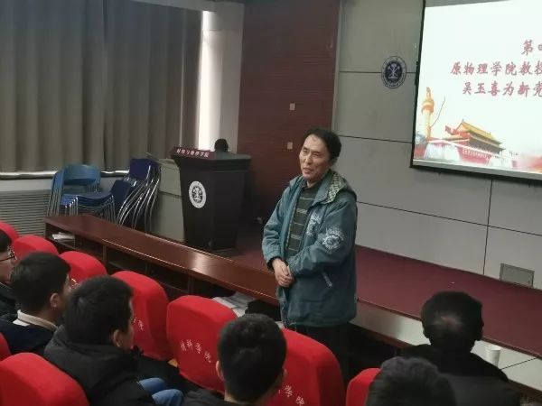 1月3日下午,材料与物理学院在材物楼A105举行新发展党员入党宣誓仪式。原物理学院教授、老党员代表吴玉喜,学院关工委常务副主任曹炜和2019年下半年所有新发展党员共同参加活动,宣誓活动由学院学生党建助理、兼职辅导员黄子洋主持。