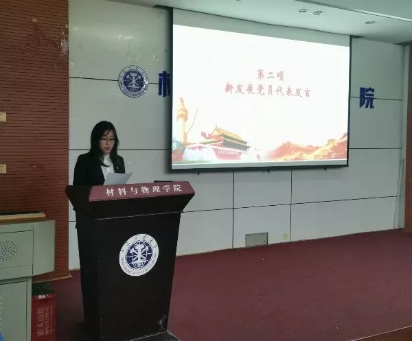 宣誓仪式在雄壮的国歌声中开始。首先,材料本科生第二党支部、2016级学生党员孟家曦代表新发展党员发言,她介绍了自己的入党历程,从思想、工作、学习等不同角度,讲述了自己在党的教育和感召下综合能力不断加强的过程,并表示今后将以党员身份严格要求自己,充分发挥模范带头作用;而后,全体党员面向党旗进行宣誓。参加宣誓仪式的吴玉喜老师结合自己三十余年的党员经历,从提高学习成绩和业务能力、发展共产党员的奉献精神、积极学习党的理论和政策、严守纪律四个方面向所有新发展党员提出期盼。宣誓仪式在校歌声中结束。