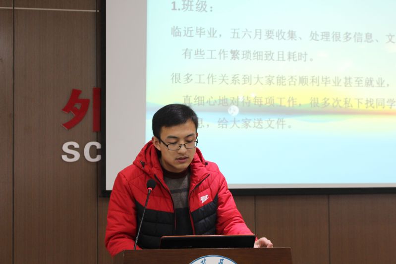 为进一步做好2018年下半年党员发展与转正工作,加强学院党组织建设。2018年11月23日,外文学院于文科楼B508室举行了学生党员发展预审及转正答辩会。外文学院党委书记何康林,关工委常务副主任李灏,党委副书记王文杰出席会议并担任评委,此外担任评委的还有外文学院关工委秘书长、团委书记胡滢颖,兼职辅导员吴倩、闫瑾、李龙飞,以及党员和入党积极分子代表。共8名预备党员,18名发展对象参加本次答辩。