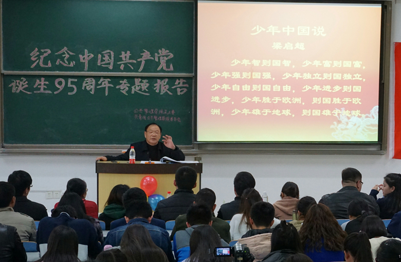 11月16日,公共管理学院(原文法学院)关工委举办了纪念中国共产党诞生95周年专题报告会。本次报告会由公共管理学院关工委常务副主任庄汉新教授主讲,公共管理学院党委副书记丁恒星老师主持会议。2016级辅导员王贝贝老师,兼职辅导员刘世通、王云飞、闵颖、孙艺铭等以及各年级学生代表参加报告会。