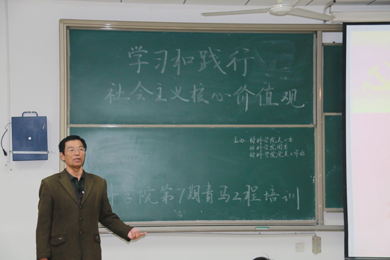 11月18日下午,由材料学院关工委、院团委、院党员工作站共同主办的材料学院第七期青马工程骨干培训之“学习和践行社会主义核心价值观”专题讲座在教2B204举行。本次讲座邀请到了材料学院关工委常务副主任曹炜老师担任主讲人。材料学院第七期青马工程学员、各年级入党积极分子以及2015级学生骨干等参加了本次讲座。2012级辅导员齐宪涛老师、院团委书记弓海军老师与同学们一同聆听了本次讲座。