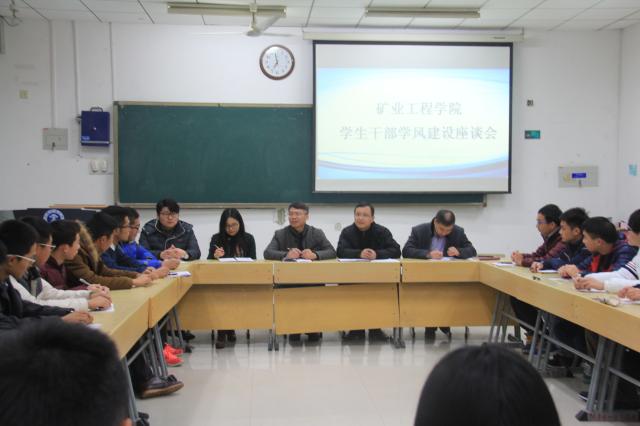 为进一步了解学生的思想动态和学风建设中存在的问题,推动学风建设扎实、深入开展,12月1日晚,矿业学院关工委在博学4楼B104教室召开学生干部学风建设座谈会。院关工委主任张东升,副主任畅军亮,秘书长黄金与全体专兼职辅导员及学生干部代表参加了此次座谈会。