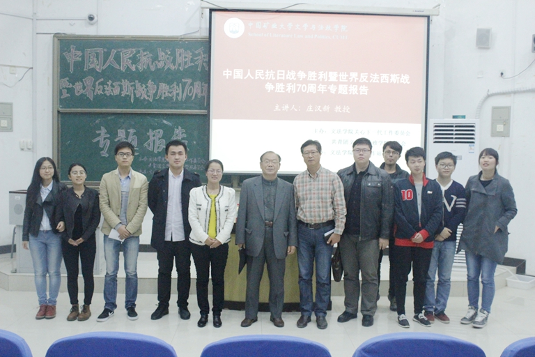 10月28日晚7时,原中国矿业大学文法学院中文系教授、研究生导师,现中国矿业大学文法学院关工委常务副主任庄汉新教授面向文法学院做中国人民抗战胜利暨世界反法西斯战争胜利70周年专题报告。出席本次报告会的有文法学院党委书记杨思留,文法学院团委书记李玉雪,12级辅导员王贝贝,14级辅导员王云飞。本次活动由文法学院关心下一代工作委员会和共青团文学与法政学院委员会主办,文法学院党员工作站承办。